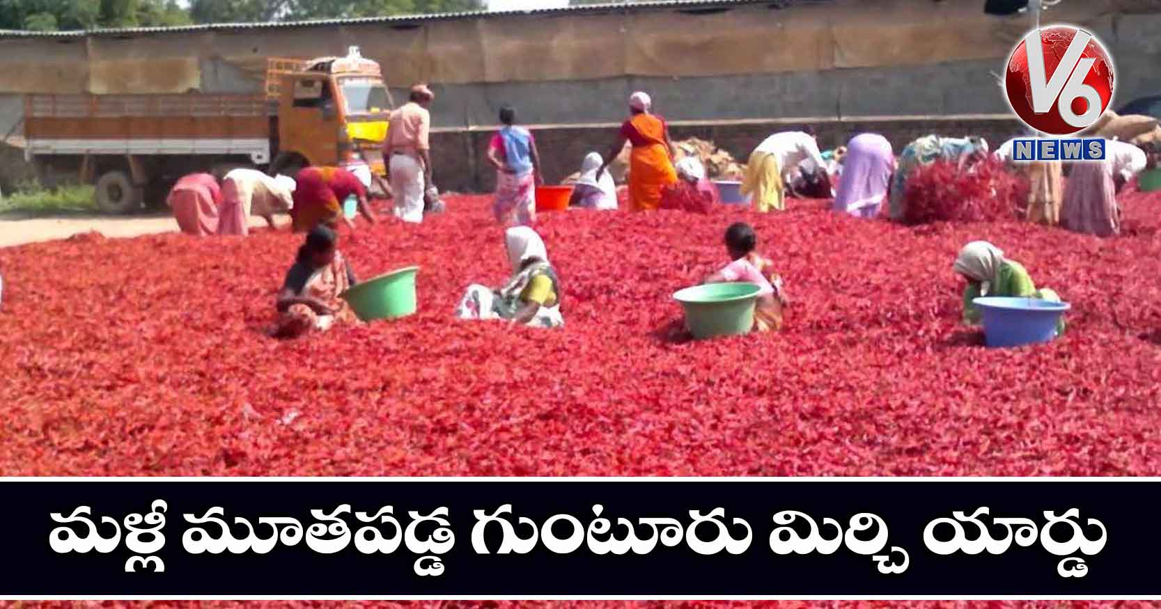 గుంటూరు: కరోనా తీవ్రత రోజు రోజుకూ పెరుగుతుండడంతో గుంటూరు మిర్చి యార్డు మళ్లీ మూతపడింది. ఈ నెల 19వ తేదీ వరకు మార్కెట్ మూసివేస్తున్నట్లు అధికారులు ప్రకటించారు. గుంటూరు జిల్లా వ్యాప్తంగా కరోనా తీవ్రత నేపథ్యంలో 23 కంటైన్మెంట్ జోన్ లను కలెక్టర్ ప్రకటించారు. మిర్చి యార్డు కూడా కంటైన్మెంట్ జోన్ పరిధిలోకి వస్తుండడంతో మూసివేత తప్పలేదని అధికారులు చెబుతున్నారు. ఇప్పటికే సరుకు తెచ్చిన రైతులకు ఇబ్బందికర పరిస్థితి ఏర్పడినా మరో మార్గం కనిపించడం లేదన్నారు. వర్షాలు కురుస్తుండడంతో మిర్చి తడవకుండా టార్పాలిన్లు.. కవర్లతో మూసివేసి జాగ్రత్తపడుతున్నారు.