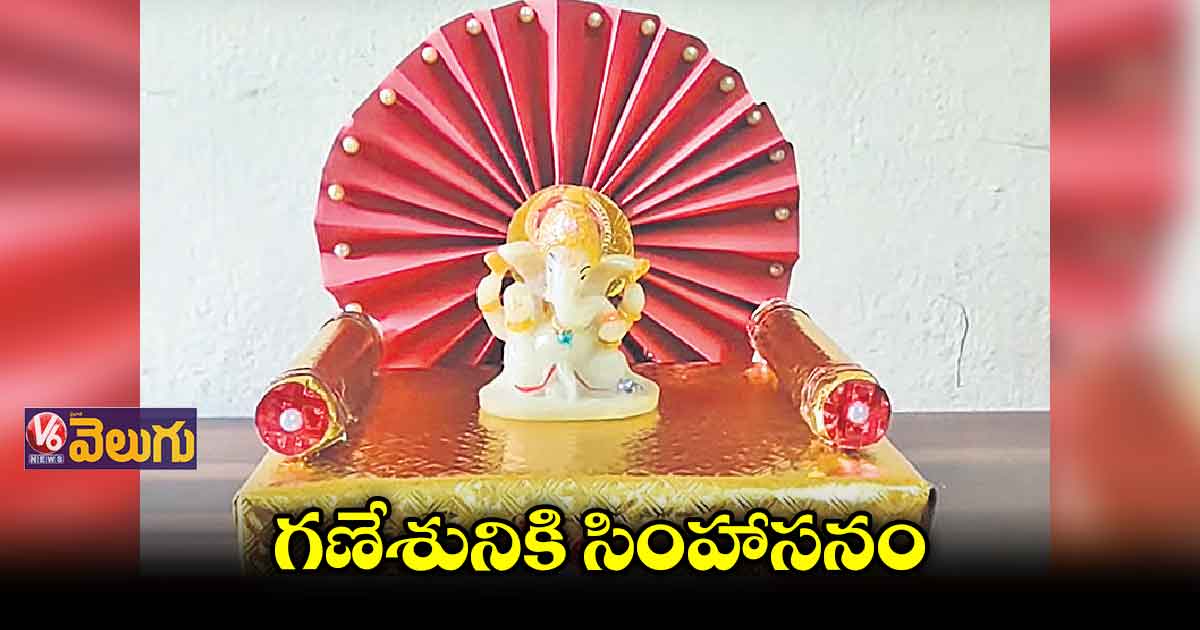 తయారీ : అట్టముక్కకు మధ్యలో కత్తెరతో రెండు చీలికలు పెట్టాలి. దాన్ని ఖాళీ పేపర్ బాక్స్ మధ్యలో పెట్టి, గమ్తో అతికించాలి. చీలికల మధ్యలో మరో రెండు అట్ట ముక్కల్ని పెట్టి, బాక్స్ పైన మూత పెట్టాలి. ఆ బాక్స్ చుట్టూ గోల్డ్ కలర్ డెకరేటివ్ పేపర్ అంటించాలి. తరువాత కలర్ పేపర్ని పొడవుగా కత్తిరించాలి. అలాంటివి మూడు ముక్కలు రెడీ చేసుకోవాలి. వాటిని ఒక్కోటిగా మడతలు పెట్టి ఒకదానితో ఒకటి అతికించాలి. అప్పుడు బొమ్మలో చూపించినట్లు పువ్వు ఆకారంలో రౌండ్గా కనిపిస్తుంది. దాని మధ్యలో గోల్డ్ కలర్ పేపర్ అతికించాలి. అట్టముక్కల్ని రౌండ్గా చుట్టి, చివర అతికించి గొట్టాల్లా తయారుచేయాలి. వాటికి డెకరేటివ్ పేపర్ చుట్టి, దాన్ని బాక్స్కి రెండు వైపులా అతికించాలి. కావాలంటే ఇంకాస్త అందంగా ఉండేలా బొమ్మలో కనిపిస్తున్నట్టు పూసలు, వేరే కలర్ డెకరేటివ్ పేపర్స్ వంటివి వాడొచ్చు. చివరిగా వినాయకుడి బొమ్మను ఆ బాక్స్పై పెడితే బాగుంటుంది.