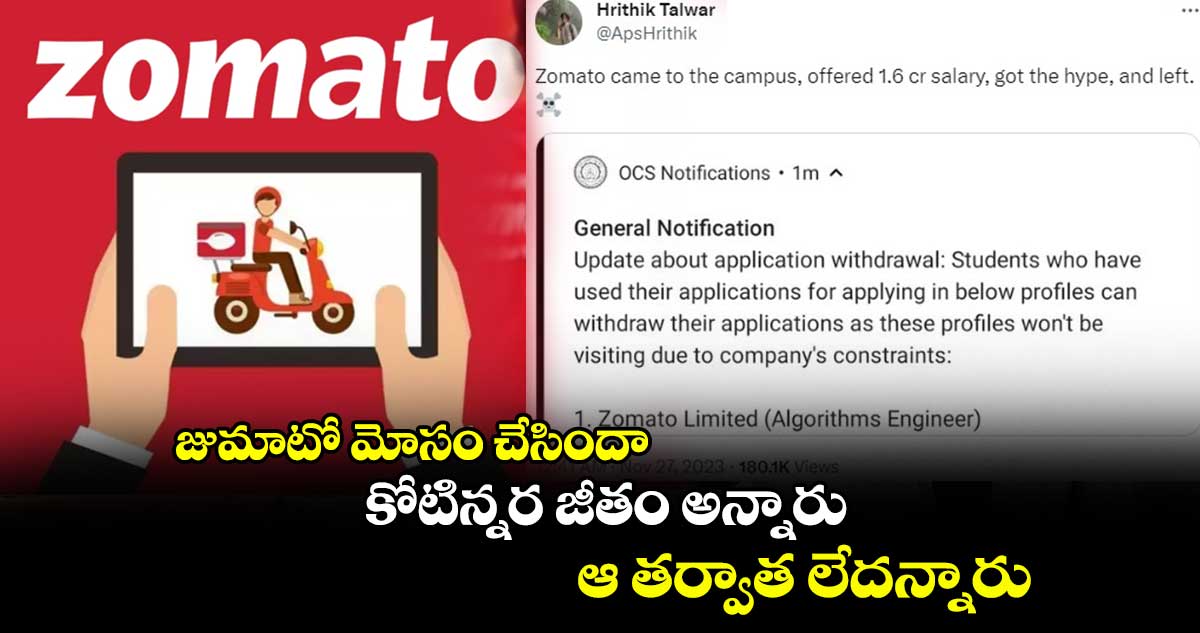 Zomatoతో సహా కొన్ని కంపెనీలు అల్గారిథమ్స్ ఇంజనీర్ ఉద్యోగాలను భర్తీ చేసేందుకు ఢిల్లీ IIT విద్యార్థులను ఎంపిక చేసి రూ. 1.6 కోట్ల వేతనం ఆఫర్ కూడా ప్రకటించింది. దీంతో విద్యార్థులు ఎంతో కుషీ అయ్యారు. ఇంతలోనే Zomato ట్విట్టర్ లో పెట్టిన పోస్టు చూసి డీలా పడ్డారు. ఈ ఆఫర్ ను తమ సంస్థ కేన్సిల్ చేసిందని ట్వీట్ చేసింది.